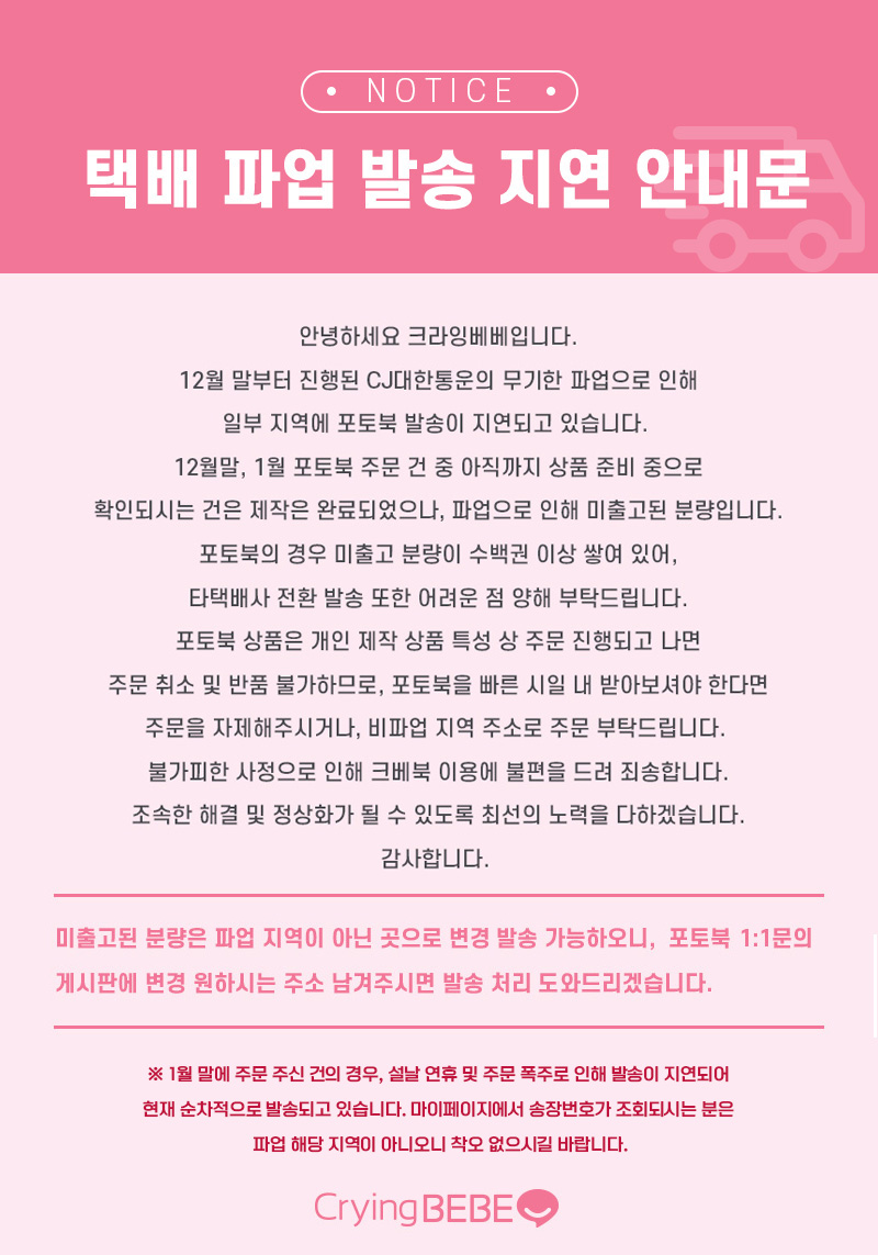 포토북 파업 관련 공지 사항 페이지 정보 작성자 크라잉베베 작성일21-07-19 18:32 조회74회 댓글0건 관련링크 앱링크 : 0회 연결 이전글 다음글 목록 본문 포토북 파업 관련 공지 사항 예전 댓글 더보기 댓글목록 등록된 댓글이 없습니다. 이전글 다음글 목록